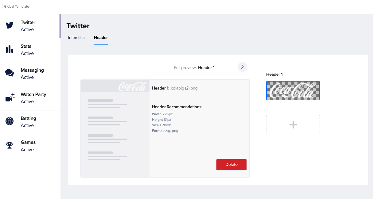 When you click on the Advertising tab on the left panel of StreamLayer Studio, you can configure the branding and advertising associated within each feature. For each of the features (Twitter, Stats, Messaging, Watch Party, etc.), you can change the sponsor assets and frequency of display for all of the various sponsorship elements, including: