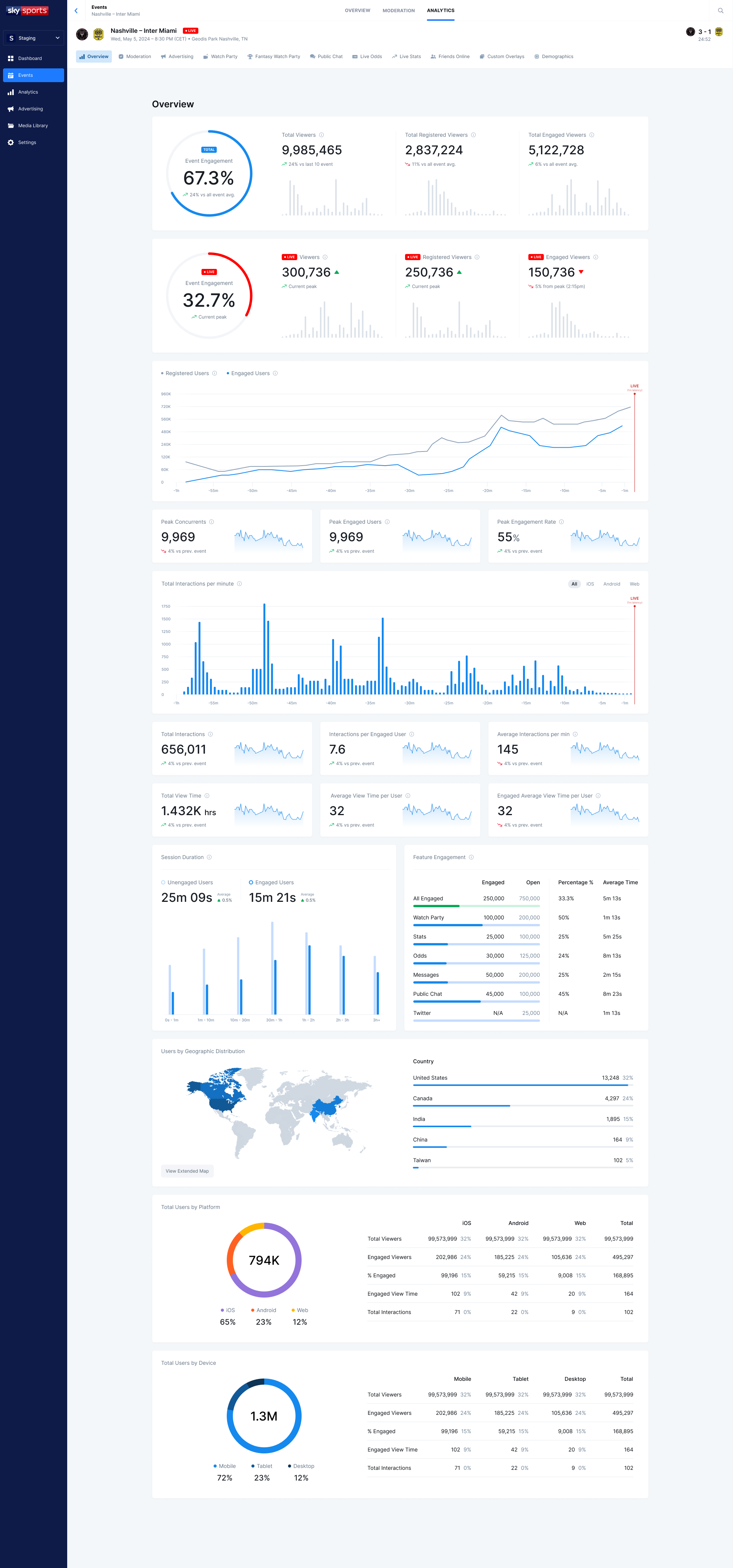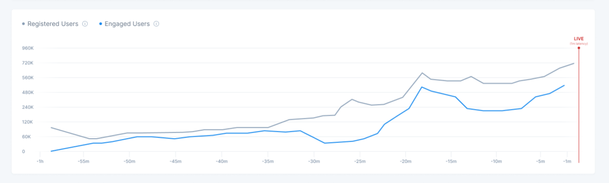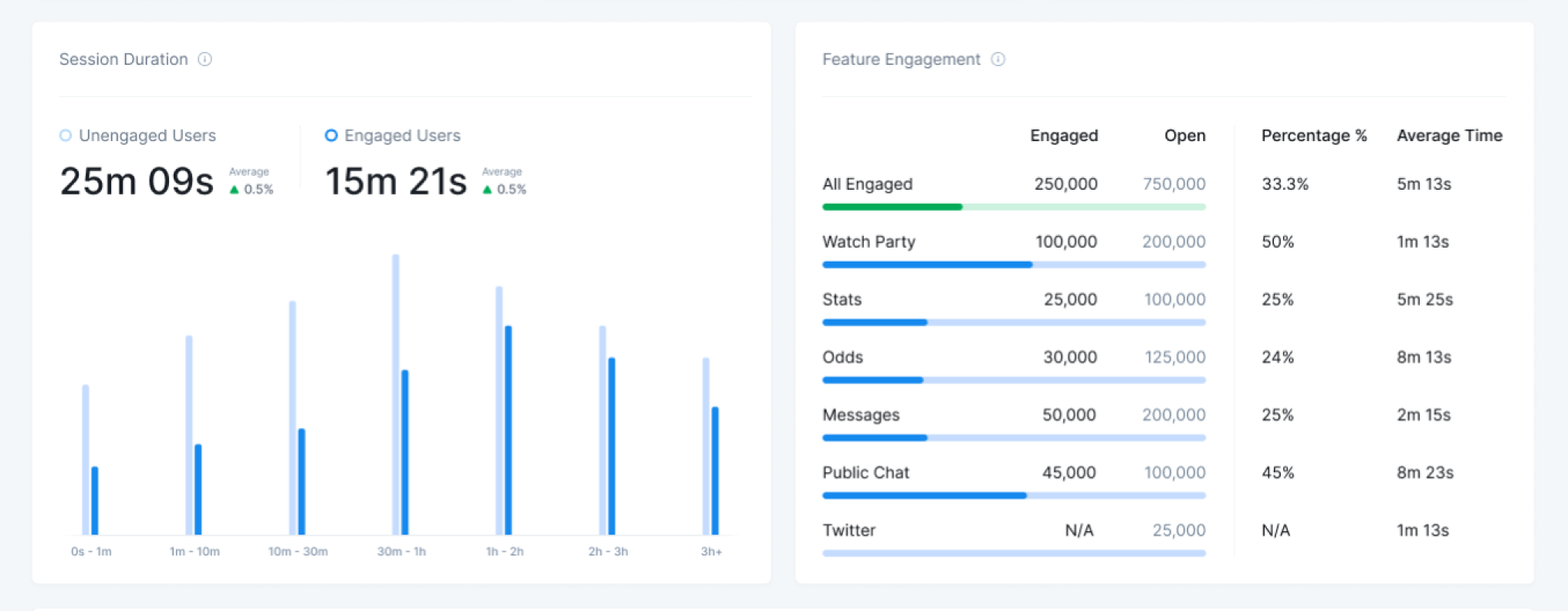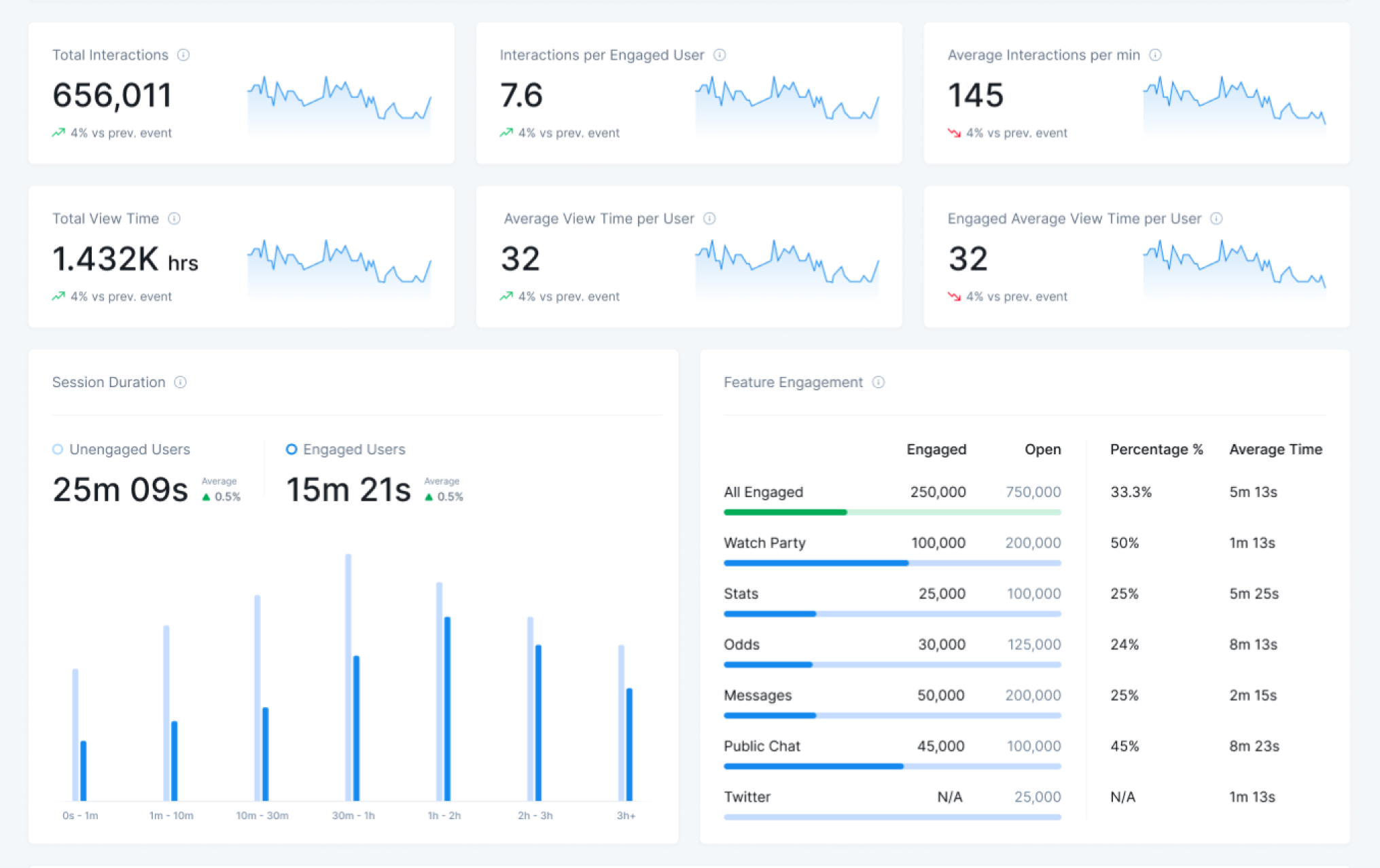 The first thing you will notice is the top line stats, which are shown across the top of the page. This top row measures the user engagement information for the event. You will see the total number of viewers, how many are “engaged” and what percent of total viewers are “engaged.” A viewer is anyone who watched the stream - counted with the “button initialized” tracking event. We consider a viewer “engaged” if they activate an overlay either by 1) selecting a notification or 2) selecting the launch button then a submenu button. We count them with the “interaction” tracking event. If a user has at least one “interaction” tracking event fired, that means that we count them in the “total engaged” metric.