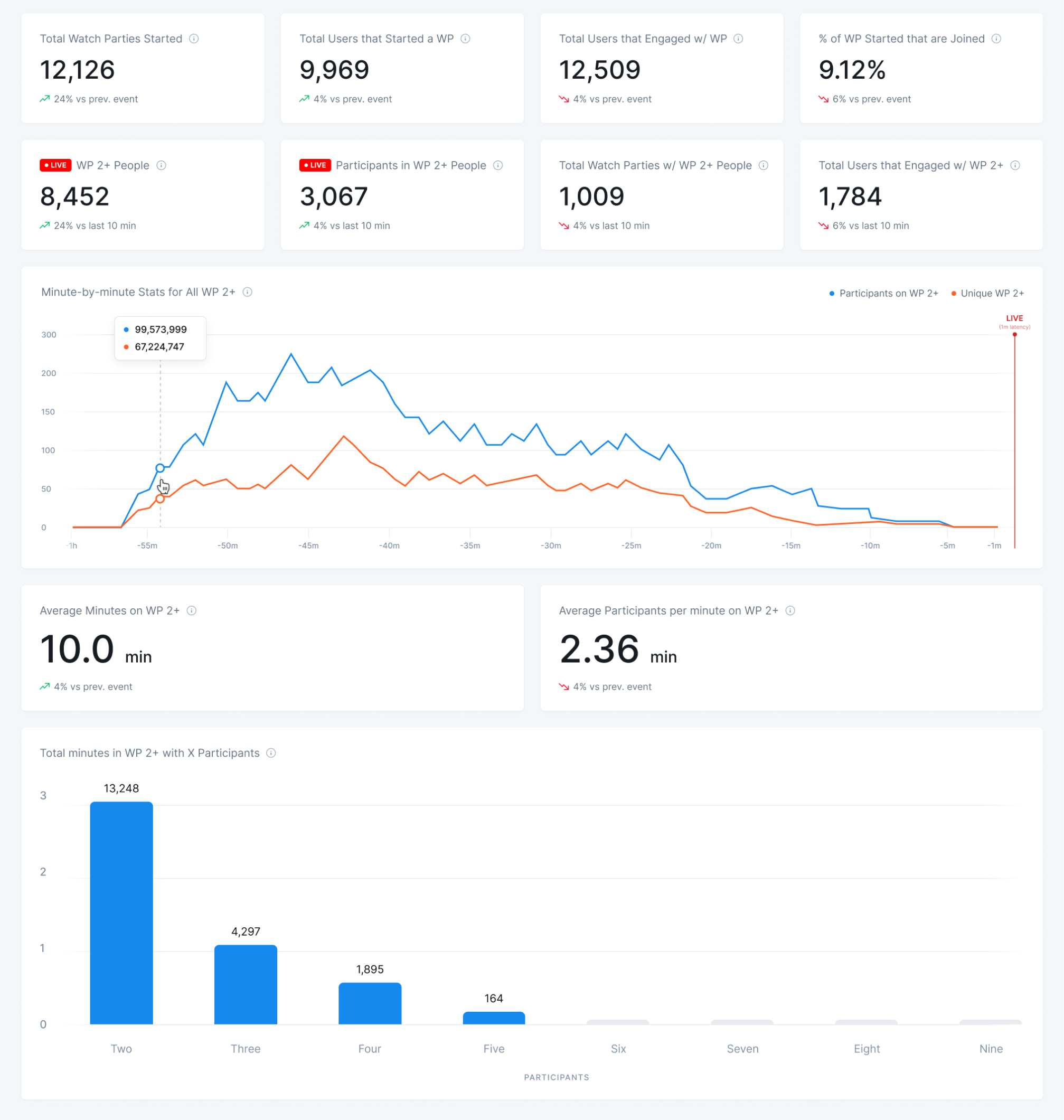 - Watch Party Notifications - the total number of Watch Party Notifications sent (both in-app and push) that were viewed during the event. Engaged shows the percentage of notifications that were tapped while the % of total viewers indicates the percentage of users who were engaged with the notification. We count call notifications with “notification received” and “notification opened” tracking events.