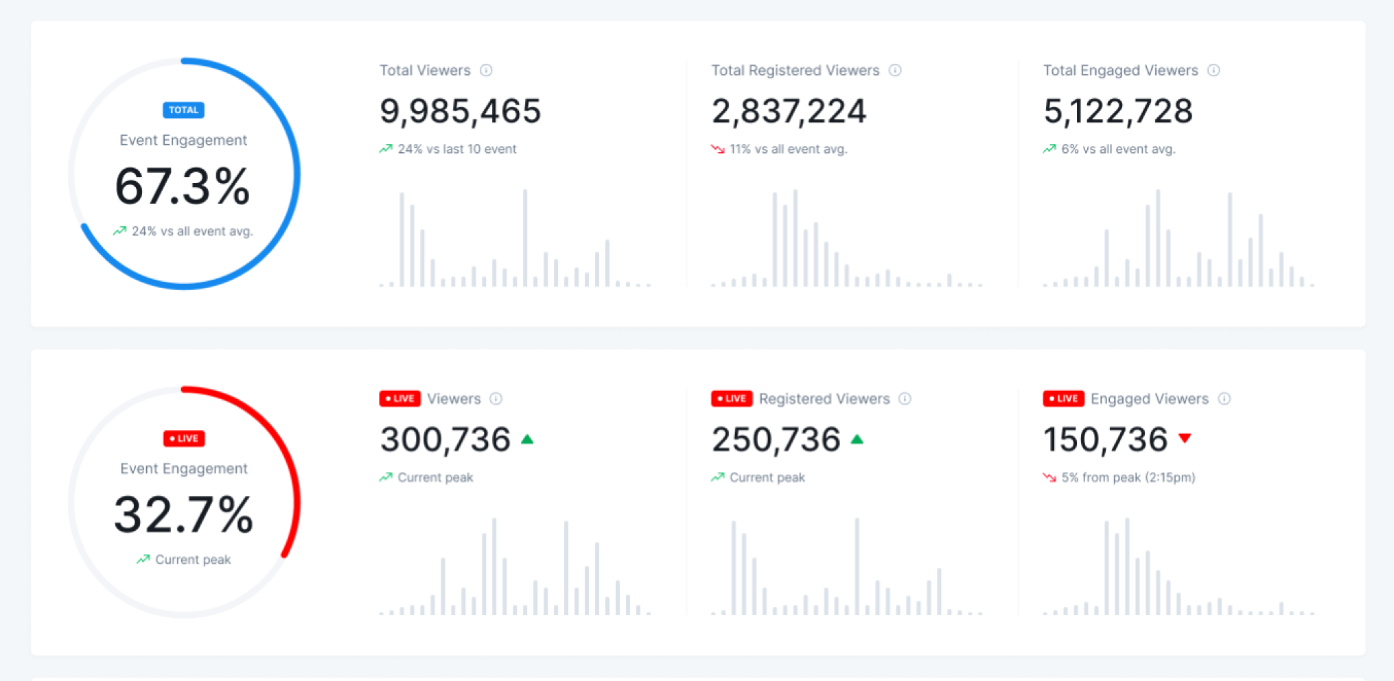 - Messaging - the total number of messages viewed, with a breakdown of a percentage of notifications that were tapped on (engaged) and a percentage of the total viewers that tapped on a notification during an event. We count messaging notifications with “notification received” and “notification opened” tracking events.
