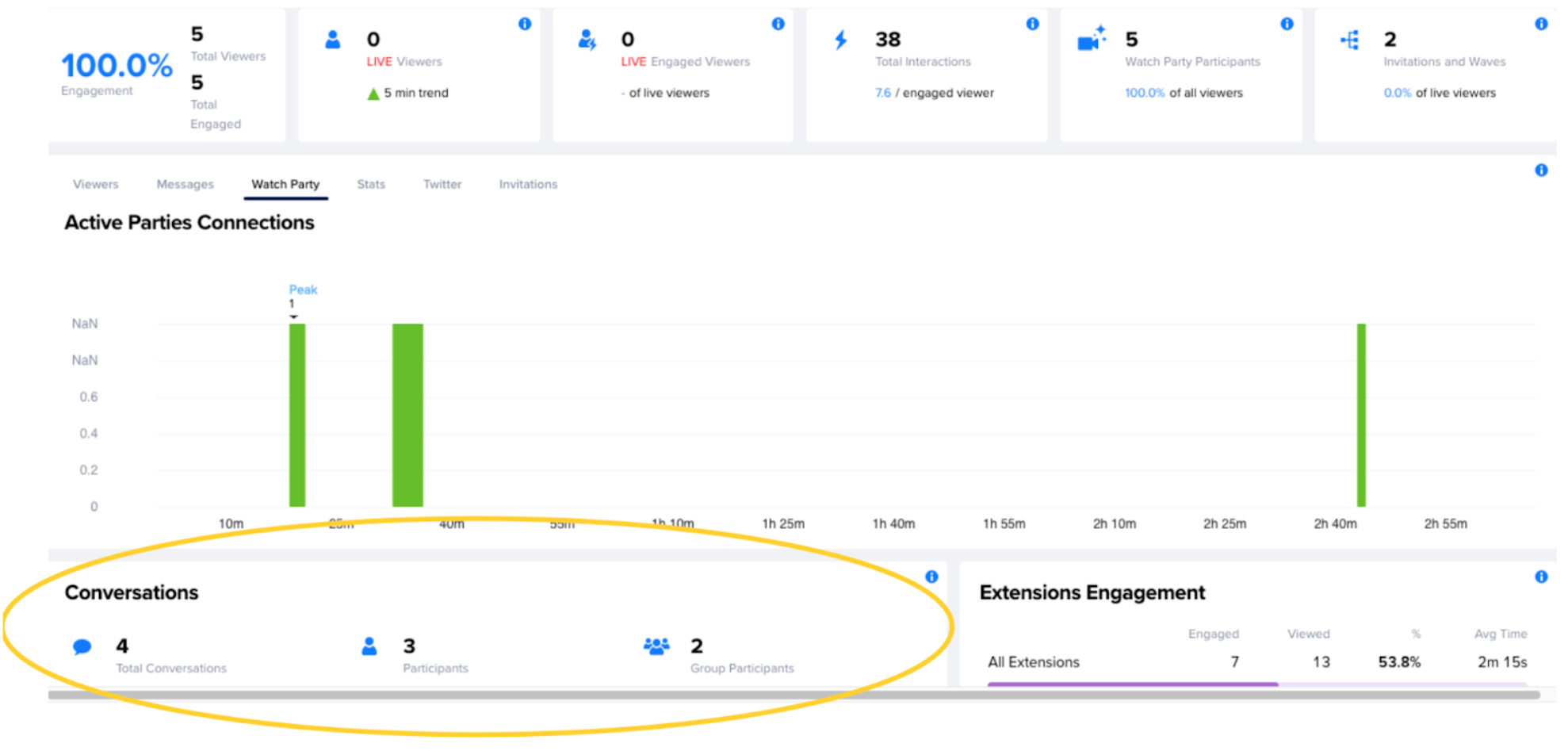 Beneath the viewership graph, the next row of boxes details Conversations. Conversations break down data about the kinds of interactions happening. How many video calls, how many group chats, how many messages are flowing back and forth between your viewers: