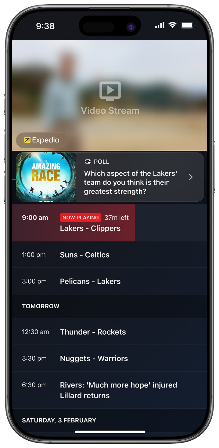 Test Advertising and Games: This integration integrates StreamLayer’s games PLUS advertising capabilities. These features allow a moderator to manually or automatically insert contextual ads and game prompts (polls, trivia, prediction, insights, highlighted tweets) relevant to game action or based upon a pre-determined cadence (i.e., every 5 minutes). Ads, game questions, or insights can be received with or without a notification and in an overlay or a squeeze back L-bar format. From ads, depending on the format, viewers can take certain actions from the ads like saving a promotion to wallet, scanning a QR code, or linking out to another application or web page. The typical StreamLayer launch menu and other feature sub-menu options will be hidden. However, clients have the option to insert a custom button they can tap to view their Games home tab to access old questions they may have missed while away or the leaderboard to see how they are tracking against their friends.