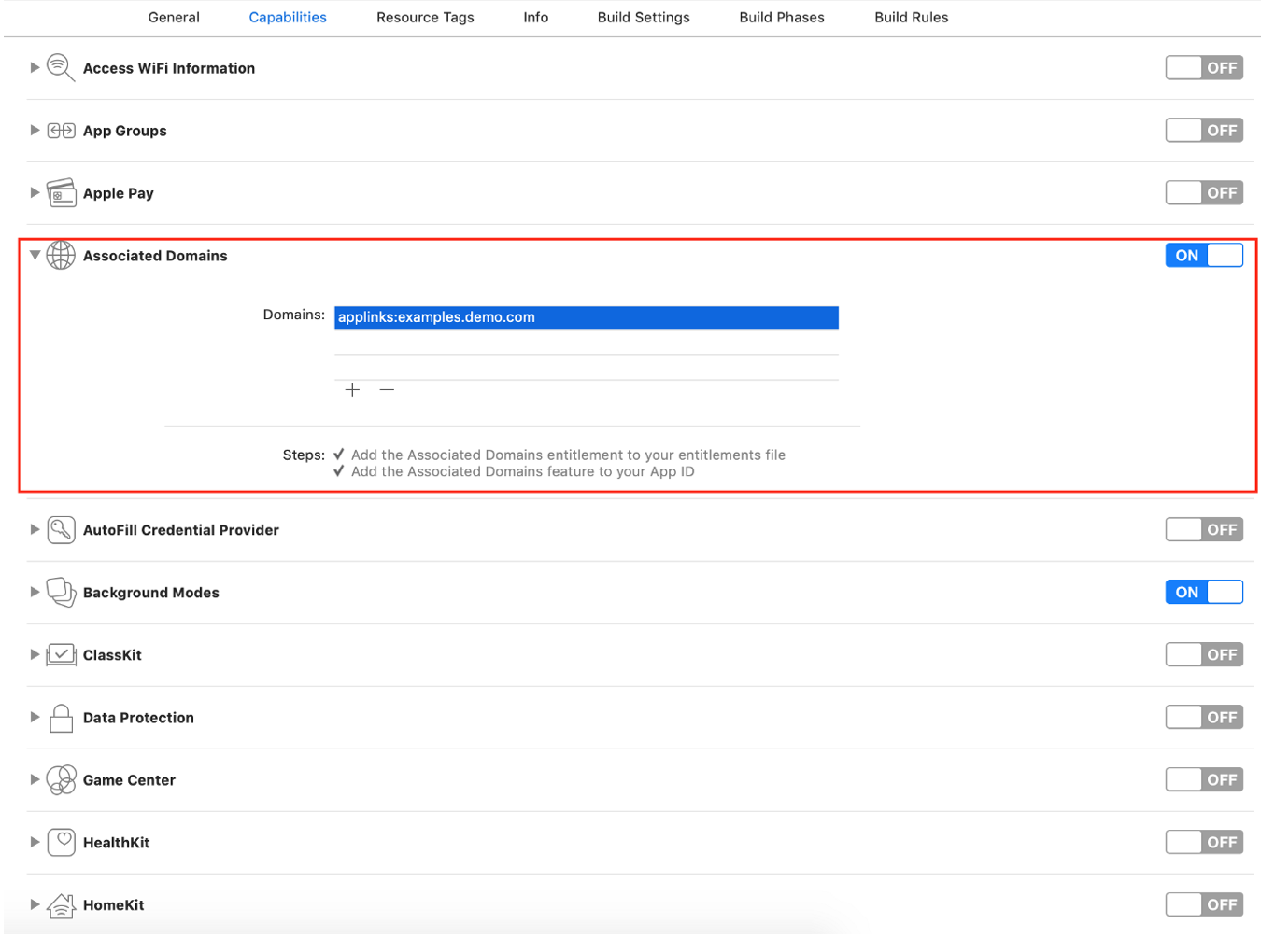 - Enable universal linking. To do this you will need to enable Associated Domains in the Apple Member Center for your Bundle ID under the Capabilities tab of your project (see screenshot below).