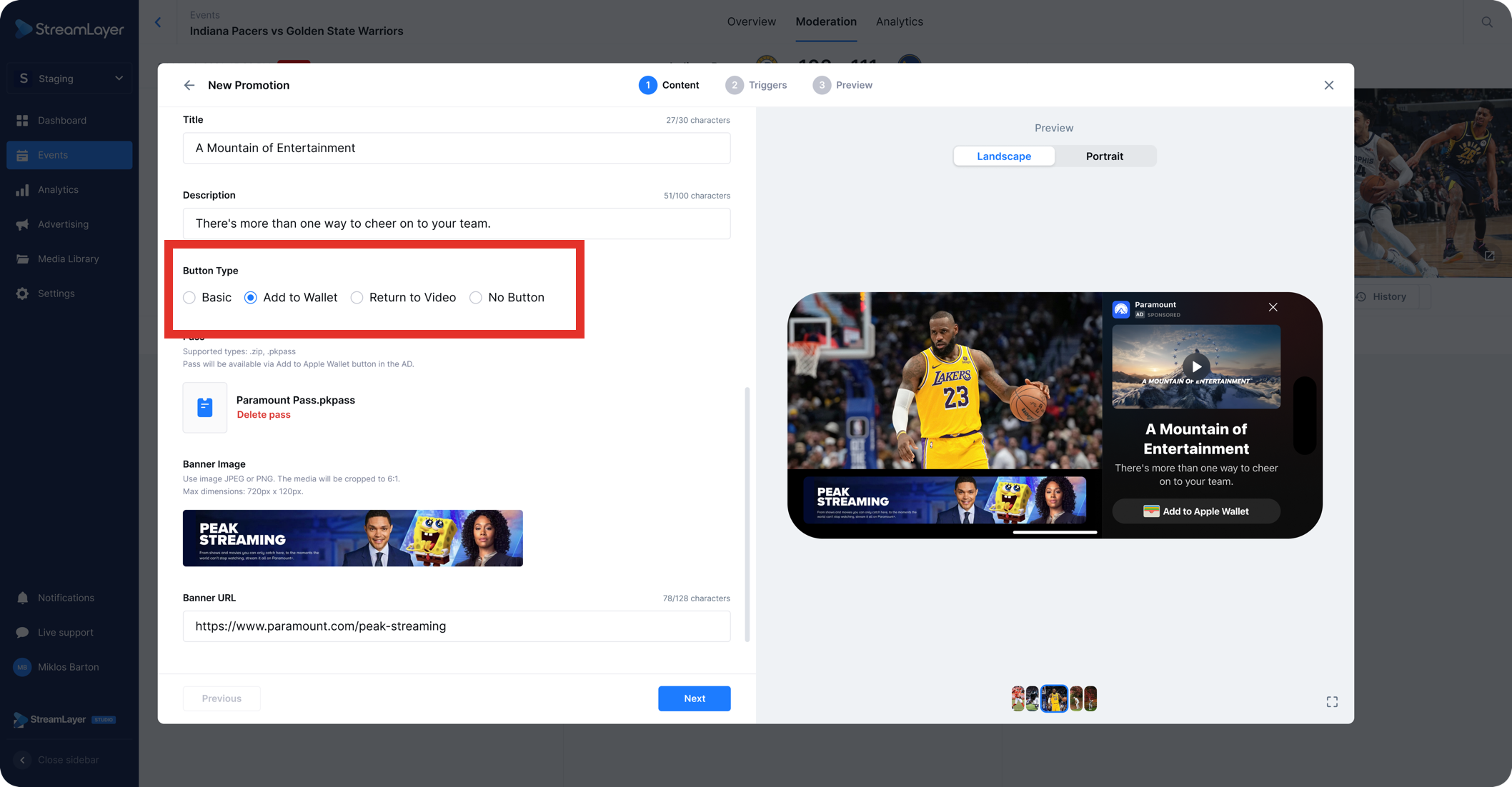 Add the sponsor, sponsor logo, media images, and descriptions. Note that notifications require a CTA so that viewers have a button to press to view more ad information.