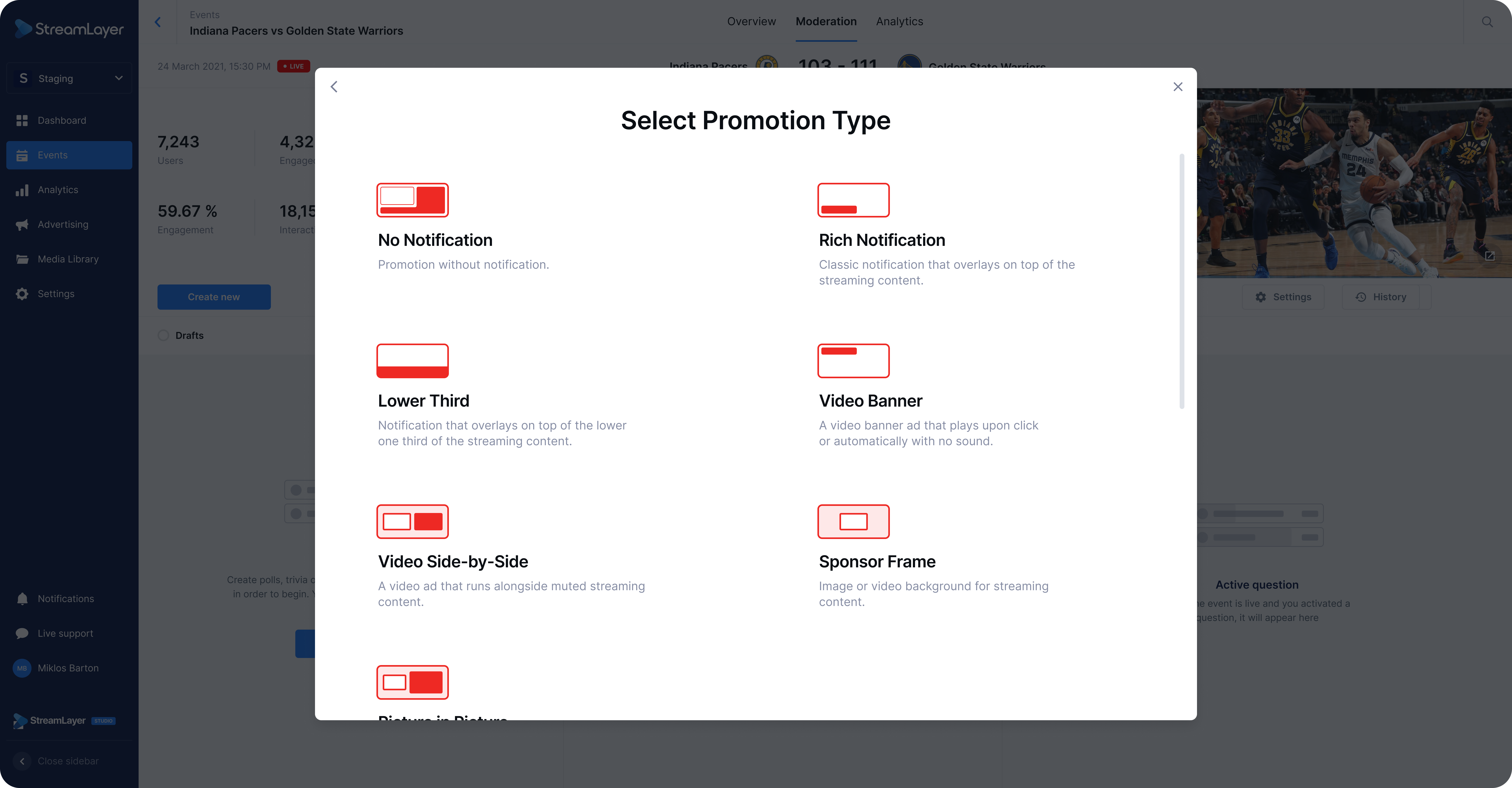 Just as you would create a game question or insight, click the Create New button on the Moderation tab of your event. Select Promotion and choose your notification style from one of the above.