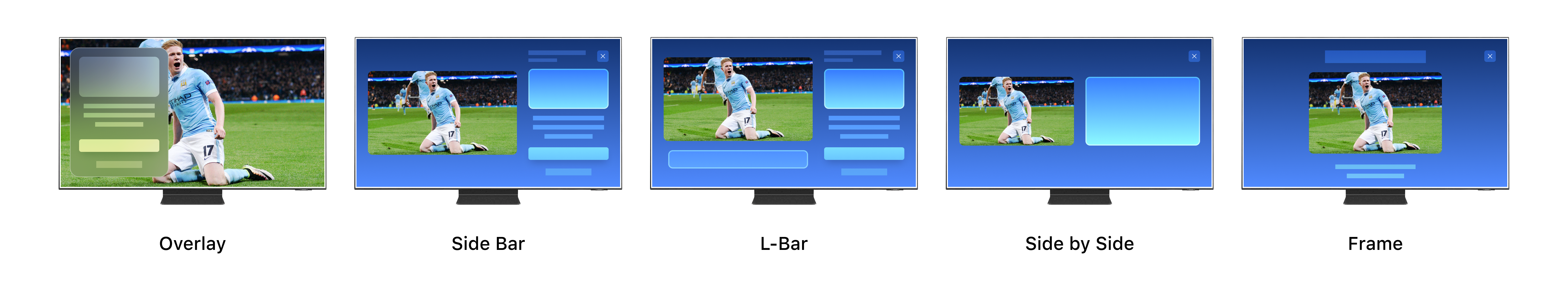 The SDK generates a transparent engagement layer that appears alongside or over video playback. Supported configurations include Overlays, Sidebar, L-bar, Picture-in-Picture, Side-by-Side Video, and Frame Video, as well as Notification Overlays, Video Overlays, and Side Notifications (for mobile, tablet, and CTV).